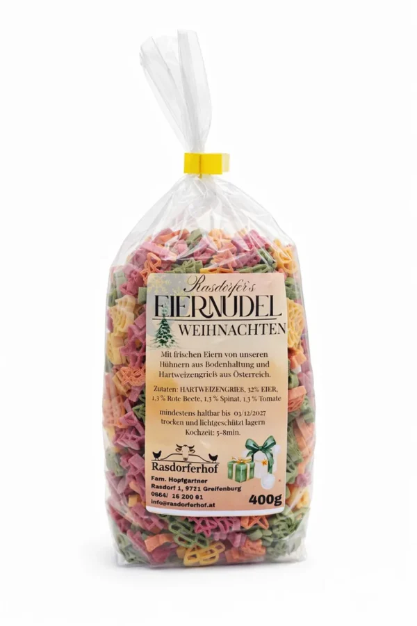 Unsere Weihnachtsnudel werden mit viel Sorgfalt und Liebe direkt am Rasdorferhof hergestellt. Die besondere Formen und die natürlichen Farben machen die Eiernudeln zu etwas ganz Besonderem.